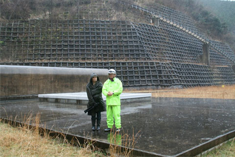 豪雨の中、国土交通省の方を捕まえて質問をしまくる極悪非道の私の図。