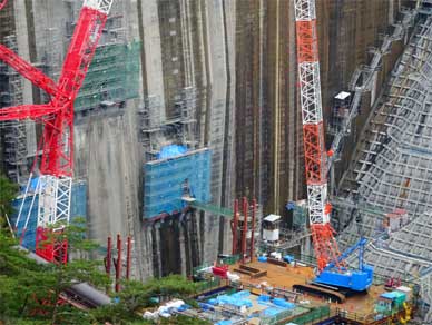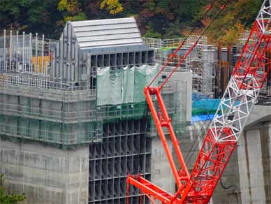 谷底でクローラクレーンが精密な操作でいろいろ運搬中。