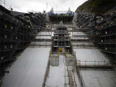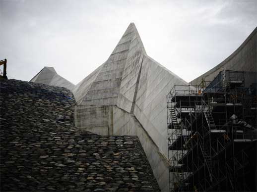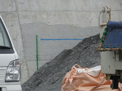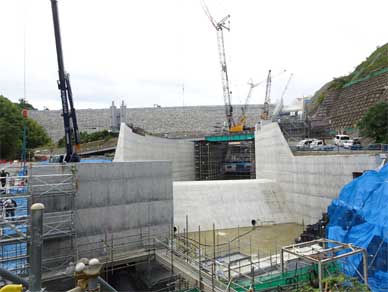 非常用洪水吐の擁壁には積み上げられていくロック材と接する部分が