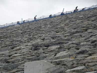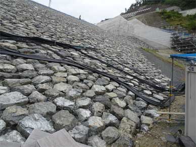 大変な人手がかかるのと同じでロックフィルダムのリップラップで