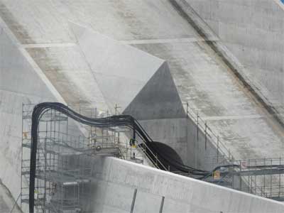 巨大な減勢池と副ダム、利水放流設備と仮排水トンネルの吐口まで全部見える。