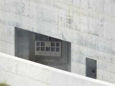 天端と洪水吐全景 常用洪水吐吐口とデフレクター
