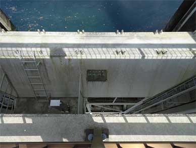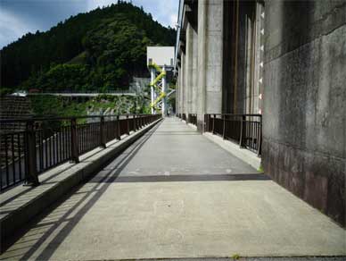 導流壁の外側に管理通路と階段がありますが立ち入り禁止でした。