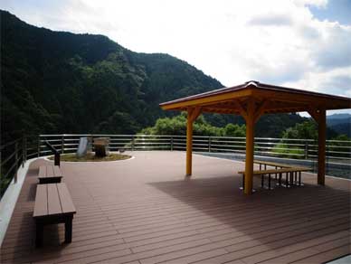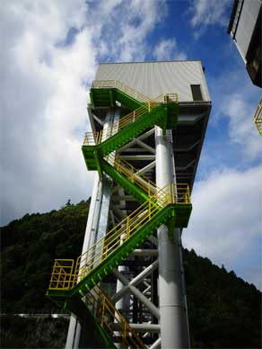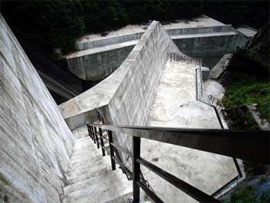 長安口ダムらしい黄色と黄緑に塗装された階段がお洒落な