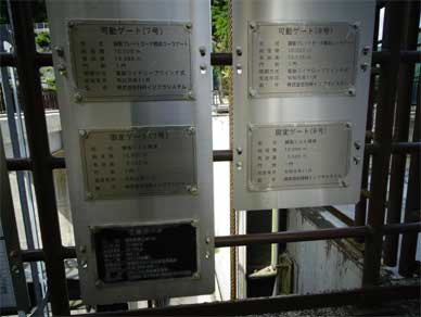 既設のクレストゲートは天端から愛でやすく上端に銘板が。