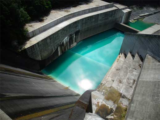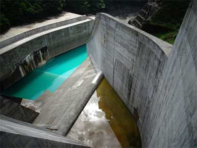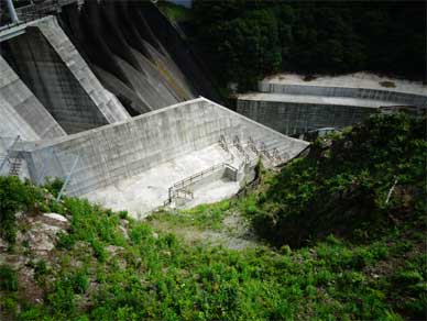 不思議な造形の堤体と導流壁と減勢工の新しいコンクリート。