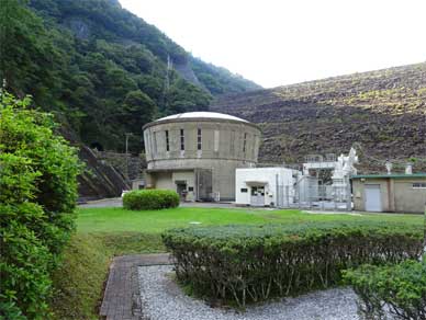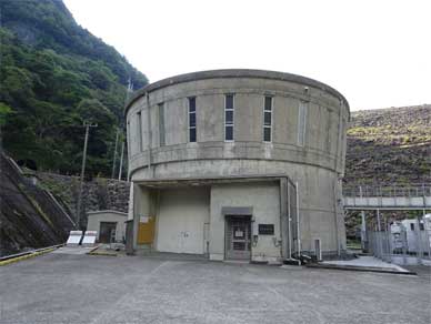 そしてこれが魚梁瀬ダムでいちばん目を引く円柱の発電所建屋です。