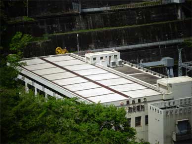 天端をどんどん進んでいくと天ヶ瀬発電所がよく見えてきます。