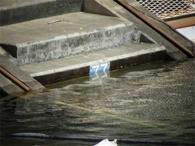 艇庫のインクラインの下の段には水位標があるので