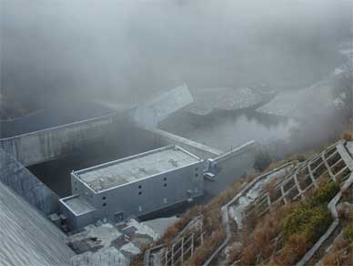 堤体下流側にゲート室上屋、その向こうにエレベーター棟