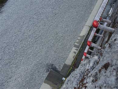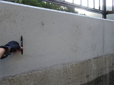 嵩上げ区間のなめらかコンクリートと、元々の岩肌の境界部分で