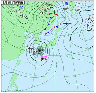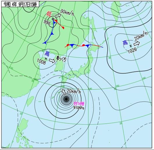 中心気圧910hPaまで発達し、鹿児島に上陸したときには925hPaでした。