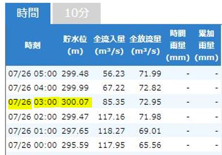 最高貯水位が03:00でEL300.07mでした。