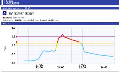 25日の20:00頃からの急激な水位上昇で一時、氾濫危険水位を超過していますが