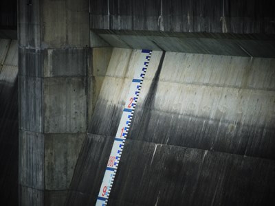 天端高欄の下ぎりぎりまでつけられている水位標。