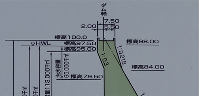 そしてさらに吃驚したのがこの天端の下の上流面の張り出しです。