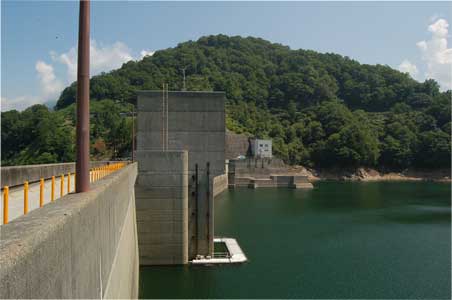 有峰ダムは高さ140mのコンクリートの“かたまり”ですが、ダムにたまった水の力により