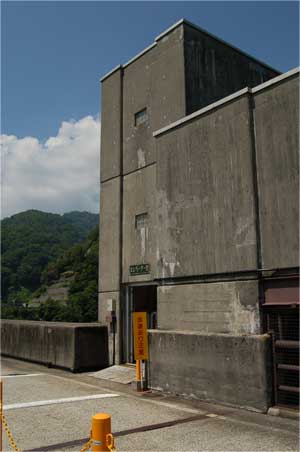 ここにクレスト洪水吐ゲートと並んで立っているのが有峰ダムのエレベーター棟です。