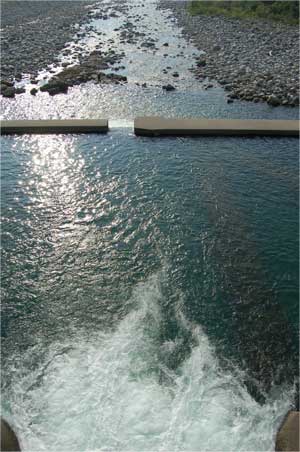 少し左岸に移動してきたところから減勢工を見ると中に何かがあるのがわかります。