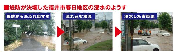 越水の後に破堤し、濁流が市街地に流れ出しました。
