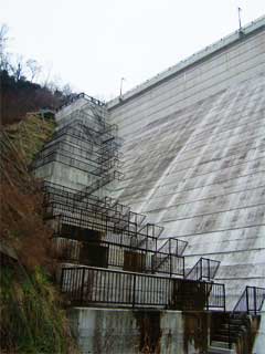曇り空、見上げるとオリフィスからさらさら放流中。 新しいダムで非常用洪水吐きも自由越流式。 多分このオリフィスもゲートレス。
