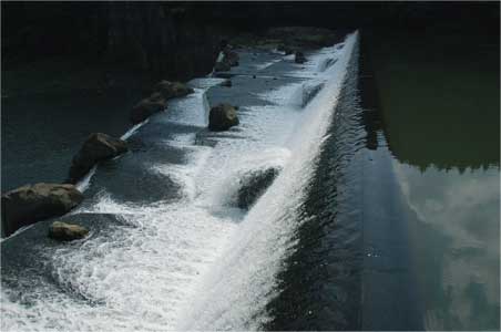 川幅いっぱいに延びるダムを超える水は石積の表面を超える時に優しい表情に変わります。