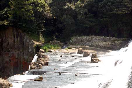 エプロンを走る水は配置された擬岩や自然石で平坦になることなく滝に向かいます。