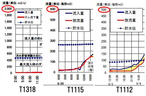 150m3/sでピークカットをしているのがとてもよくわかるT1112のハイドログラフ。