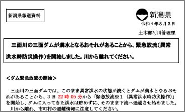 三面ダムの緊急放流のお知らせについて