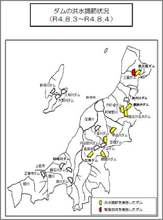 新潟県の管理ダムで防災操作を頑張ったダムたちの地図。