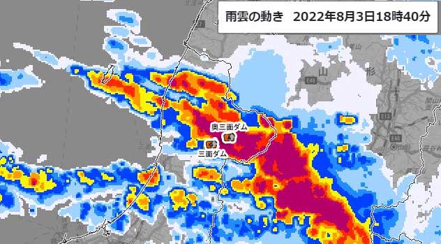 とんでもない雨域が居座っていた頃のナウキャストに三面ダムと奥三面ダムを重ねてみました。