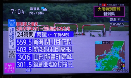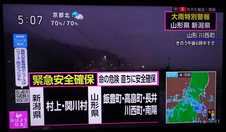 8月4日朝、NHKのニュースでは大雨と区別警報の範囲が