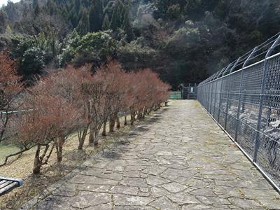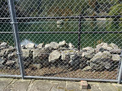 貯水池側のフェンス、石張りの天端、下流側に植栽