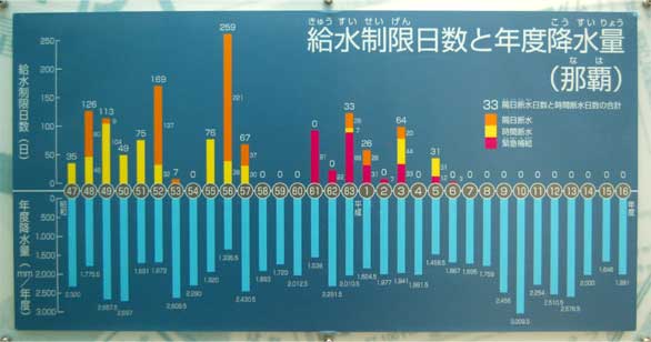 本土復帰後からの降水量と給水制限のあった日数の比較です。