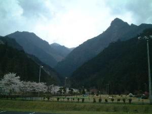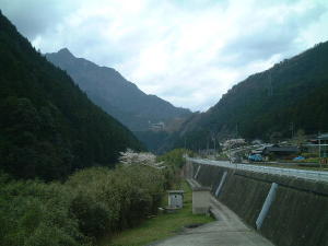 下流1kmくらいの場所にある温泉への道沿いから見上げました。