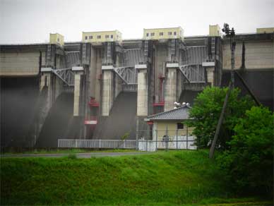 同じように堤体に穴を開けて常用洪水吐を3門増設した鶴田ダムで