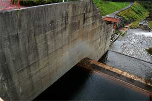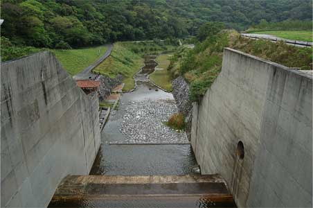 副ダムの下の減勢工にぱちゃぱちゃ流れ出ているのは河川維持用水。