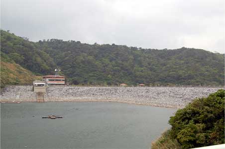 右岸洪水吐近くから見た堤体上流面。