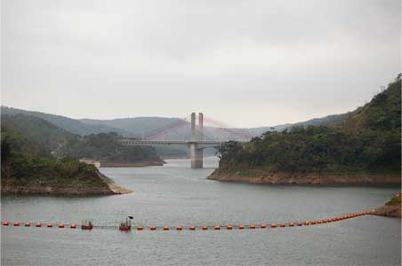 取水塔から見たダム湖と上流の“またきな大橋”。