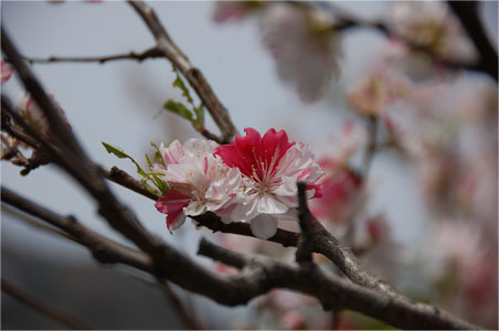 天端の横の花壇には紅白の花が一遍に咲く源平桃が満開です。綺麗きれーい♪