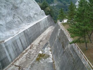 洪水吐きゲートの下流側です。 一番手前が非常用洪水吐きからの水路。 真中と奥は常用洪水吐きからの水路です。
