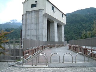 堤体右岸から天端を...。 曲がっているのでゲートしか見えませんでした(笑)