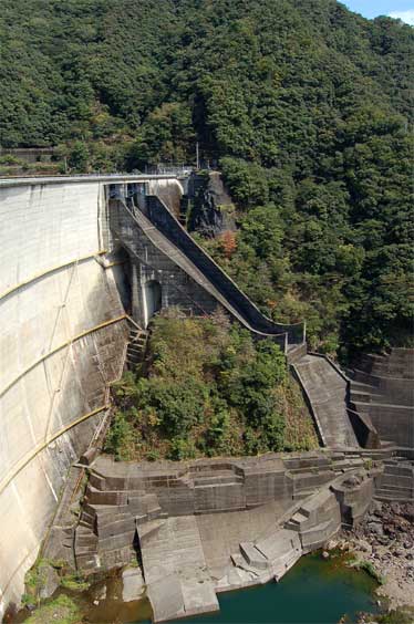 右岸のダム湖側をよく見るとコンクリートで綺麗な弧ができています。