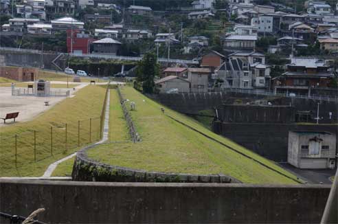 公園の端は旧堤体に繋がって美しい下流面はそのままの姿で維持されています。