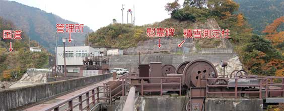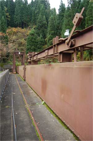 天端右岸まで来るとフェンスの向こうに大きな鉄物が鎮座していました。