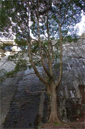 堤体のすぐ際にこんな巨木があっていいのかというサイズ。