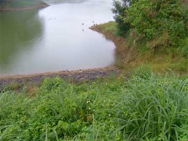 左側の盛り上がっている方に洪水吐き水路から繋がる河川。