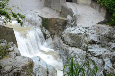 直下から見上げる岩井谷ダムの迫力は巨大なダムのそれに匹敵します。