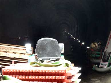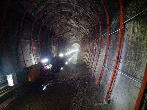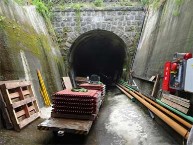 トンネルに入るとたくさんのケーブルと一緒に並べられているのが支保工の鋼材です。
