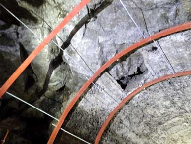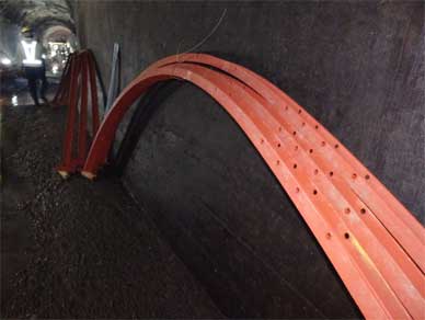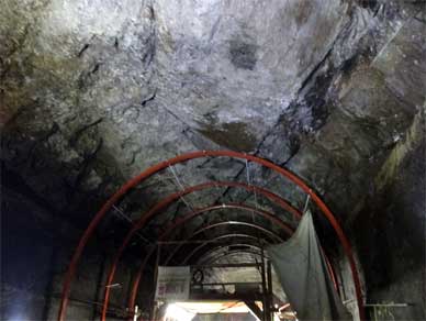 天井が素掘りなので支保工との間に隙間ができます。